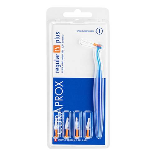 CURAPROX regular 14 plus Descrizione Lo spazzolino regular viene consigliato per la prevenzione secondaria negli spazi interdentali aperti: per otturazioni, corone, ponti e placca particolarmente ostinata. Composizione Setole: nylon. Manico: polypropylene. Parte interna: stainless stell, nickel-free. Formato La confezione contiene: - 1 manico UHS 451, colore blu - 5 testine CPS 14 coniche. Cod. 73303016