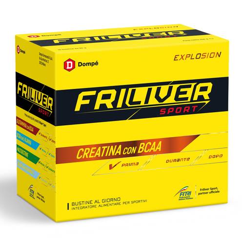 Friliver Sport EXPLOSIONDescrizione Integratore alimentare di creatina con aminoacidi ramificati. Proprietà Appositamente studiato per fornire energia istantanea a chi pratica sport. Può essere utile nei momenti di allenamento o di gara dove è richiesta disponibilità immediata di energia muscolare. La creatina, naturalmente prodotta dall'organismo, è coinvolta nei processi energetici delle cellule. Ingredienti Sodio, L-leucina, L-alanina, L-valina, L-isoleucina, Creatina (monoidrato), zucchero; acidificante (acido citrico); aromi; emulsionante E473; edulcoranti (sodio ciclamato e sodio saccarinato); colorante E160a. per 1 bus...
