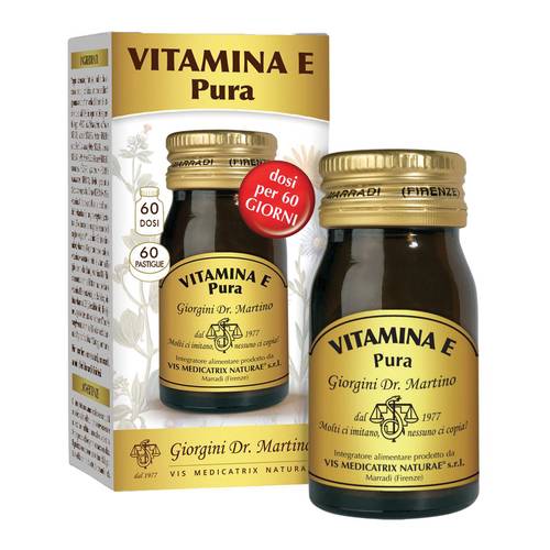 VITAMINA E PuraDescrizione Integratore alimentare a base di vitamina E, che contribuisce alla protezione delle cellule dallo stress ossidativo. Prodotto adatto ai vegani. Ingredienti Maltodestrine da mais o riso; agenti di carica: cellulosa microcristallina, gomma arabica; vitamina E naturale (acetato di D-alpha-tocoferile); antiagglomeranti: silicio biossido, magnesio stearato. Caratteristiche nutrizionali Informazioni nutrizionali per 1 pastiglia %NRV* Vitamina E naturale 60 mg (90 UI) 500 *Valore nutritivo di riferimento giornaliero (adulti) ai sensi del Reg. UE 1169/2011 Modalità d'uso Si consiglia l’...