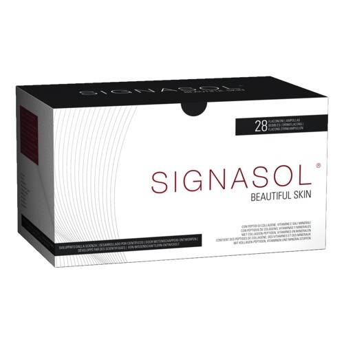SIGNASOL BEAUTIFUL SKIN Bevanda sviluppata specificatamente da scienziati. Ogni flacone di Signasol contiene un'apposita combinazione di peptidi di collagene, vitamine e sali minerali. Senza coloranti artificiali, senza alcol. Ingredienti Acqua, collagene idrolizzato, succo d’uva concentrato, succo di pera concentrato, acidificante (acido citrico), sodio-L-ascorbato, acido L-ascorbico, succo d’arancia concentrato, citrato di zinco, gluconato di rame, DL-á-tocoferile acetato, idrocloruro di piridossina, riboflavina, estratto di pepe nero (BioPerine®), D-biotina, cianocobalamina, colorante alimentare (concentrato di cartamo), aroma,...